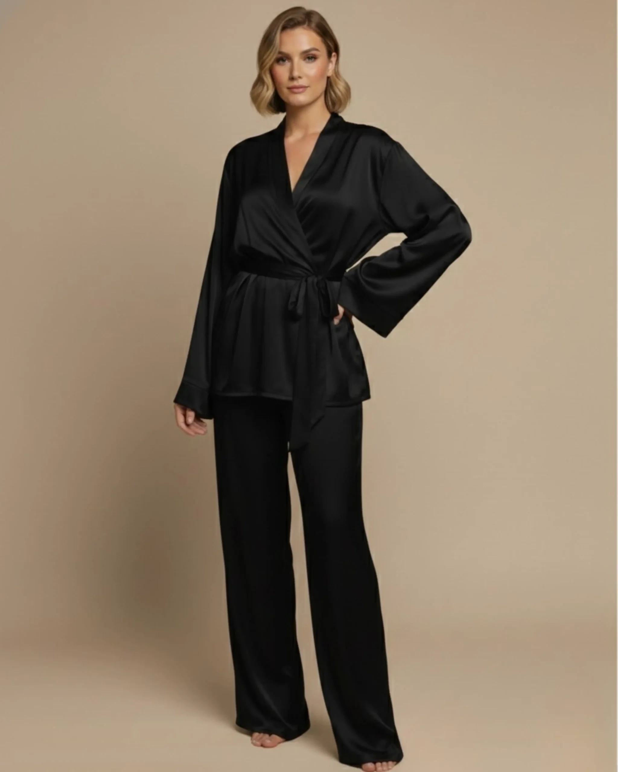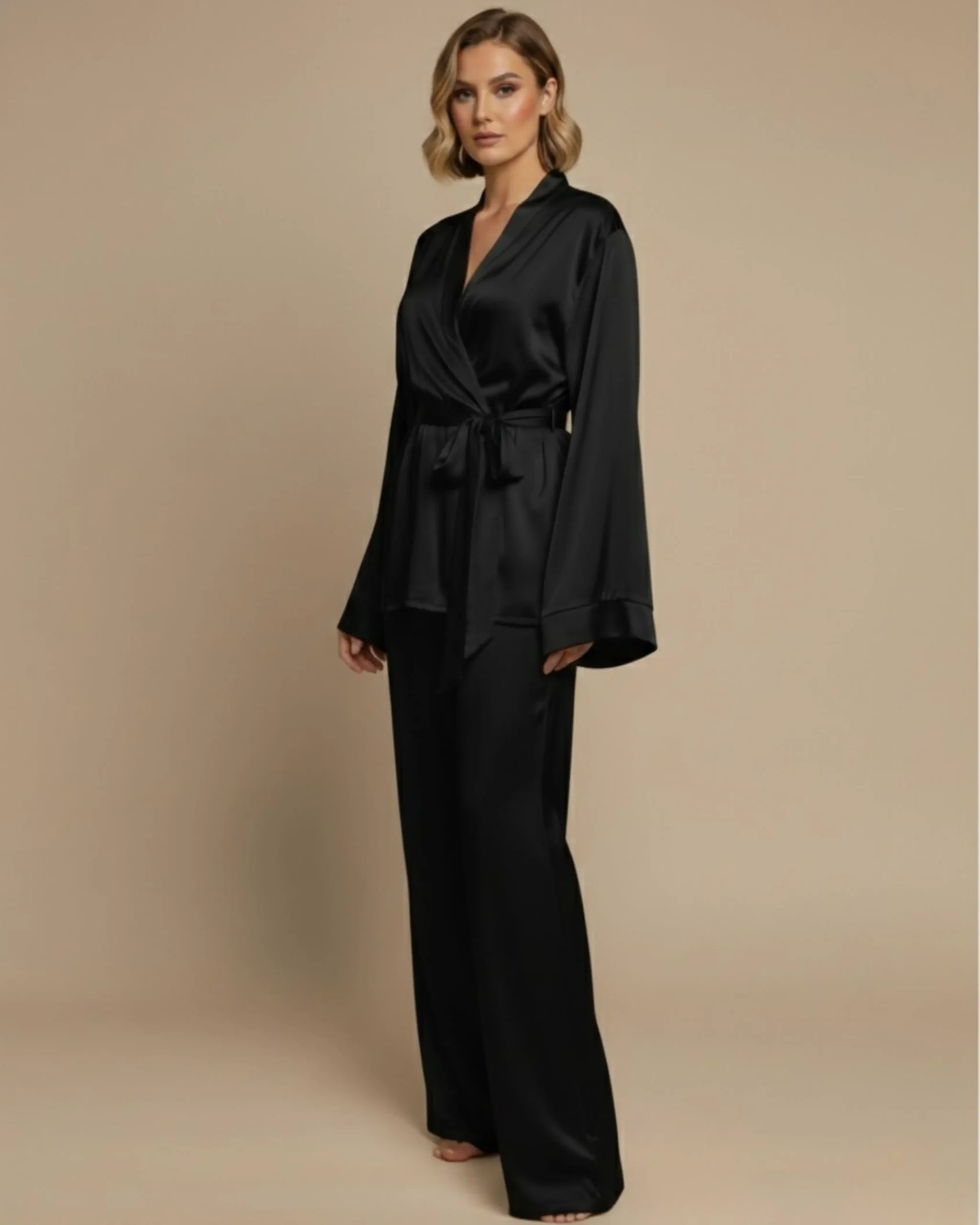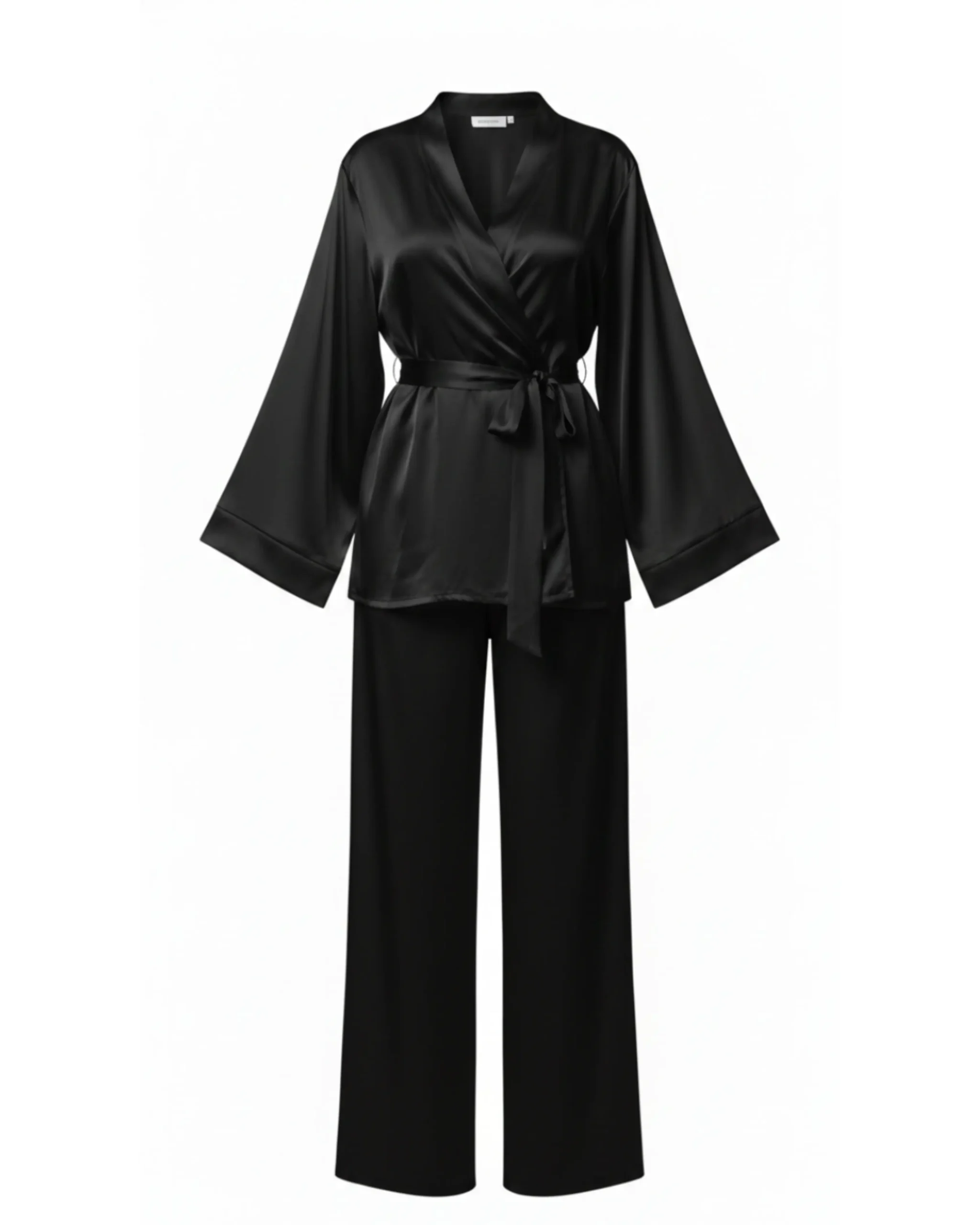The Black Kimono Set is a soft, silky two-piece set made for your refined at-home wear. Featuring a relaxed silhouette with wide sleeves and fluid straight-leg pants, this set is finished with a self-tie belt that allows for an adjustable fit, handmade with love in Lebanon.