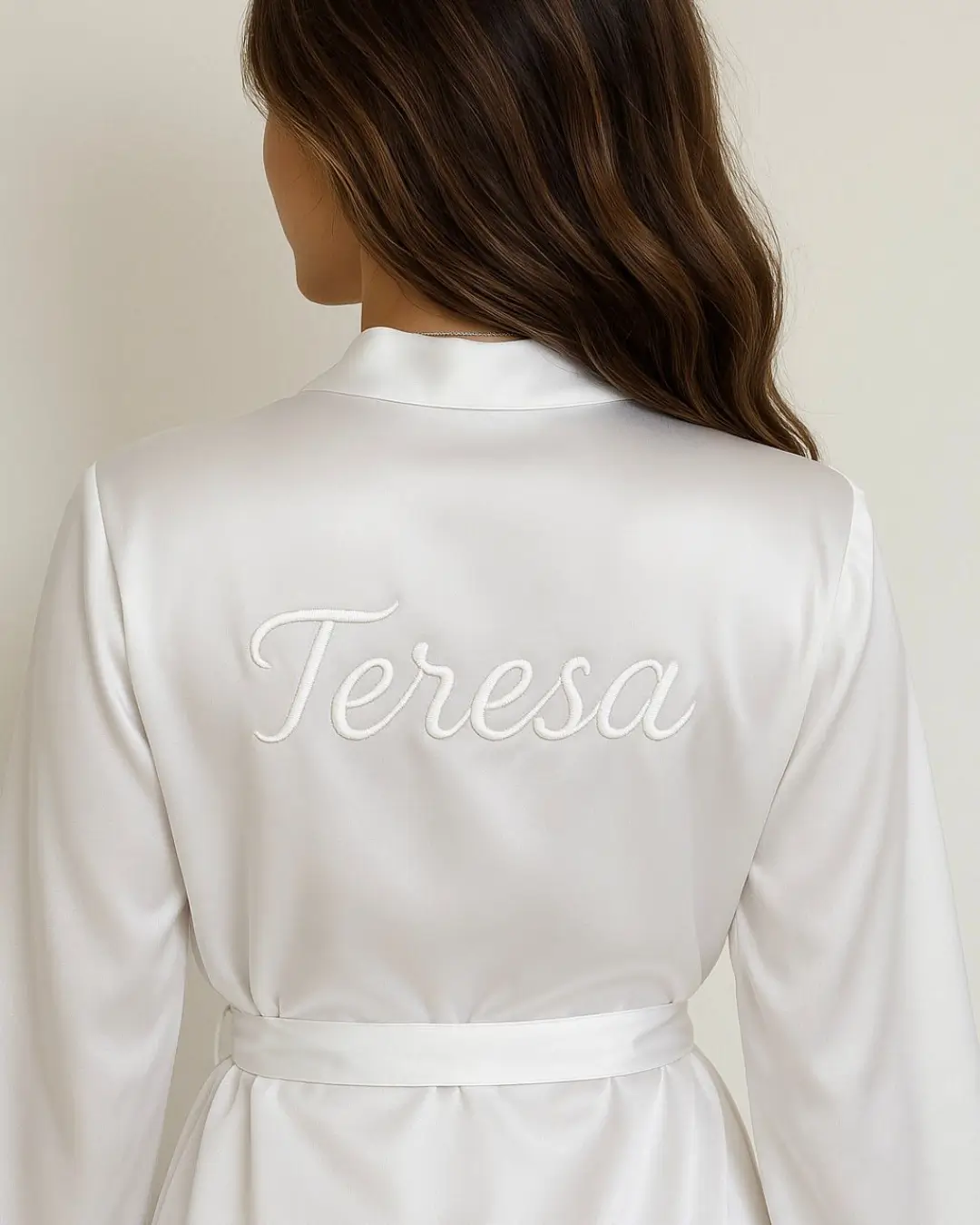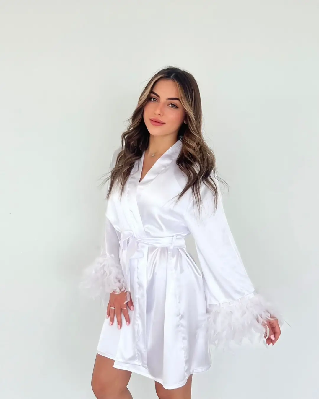 The Feather Satin Robe is crafted from silky satin with feather sleeves — a bridal favourite that adds a special touch to your wedding morning. Customisable with embroidery, it makes a meaningful keepsake for brides or as a personalised gift.