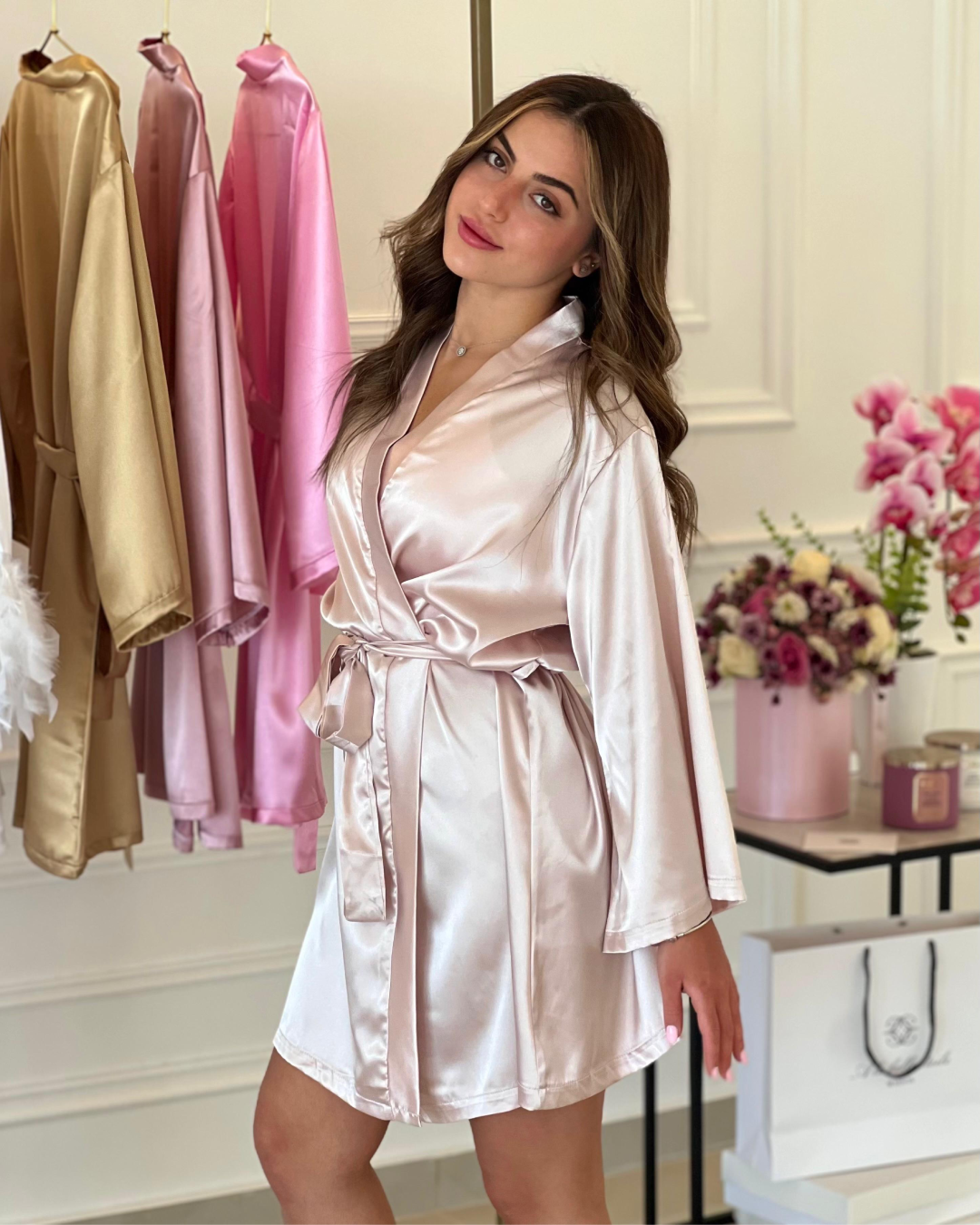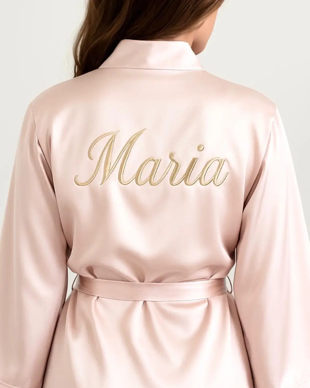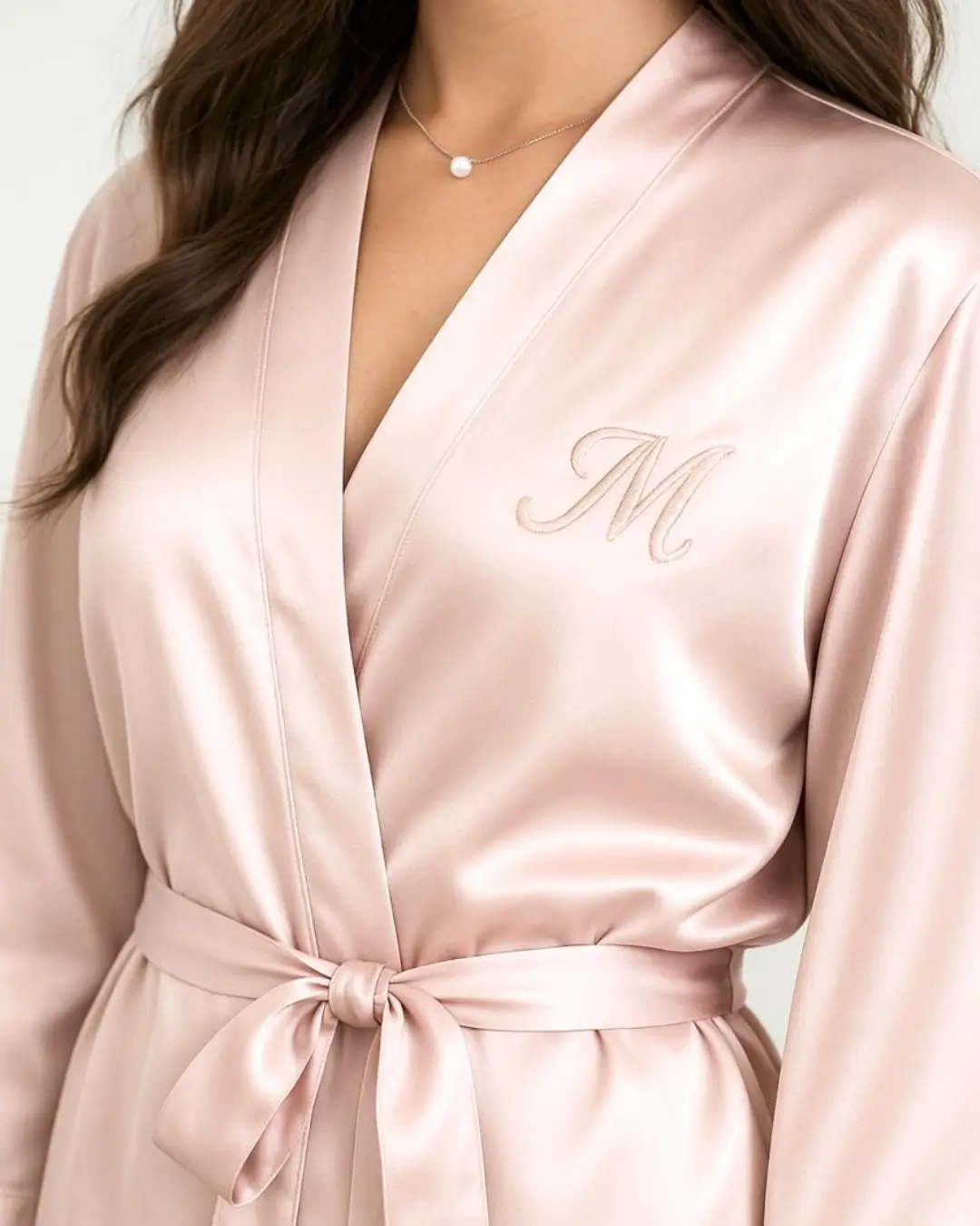 The Pearly Pink Satin Robe is crafted from soft, silky satin, in pearly-pink shade, that elevates your everyday loungewear. Perfect for bridesmaids, gifting, or relaxing mornings, this robe can be personalised with custom embroidery — making it a meaningful handmade piece.