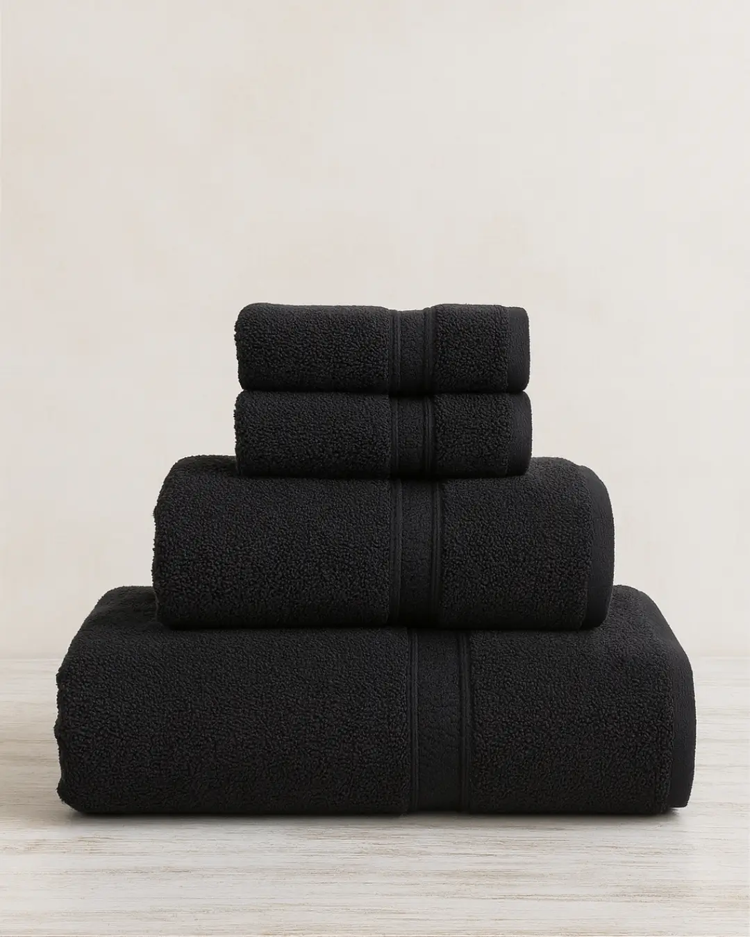 The Cotton Towel in black is crafted from 100% premium cotton with a luxurious weight (600 g/m²) , offering softness, absorbency, and comfort.